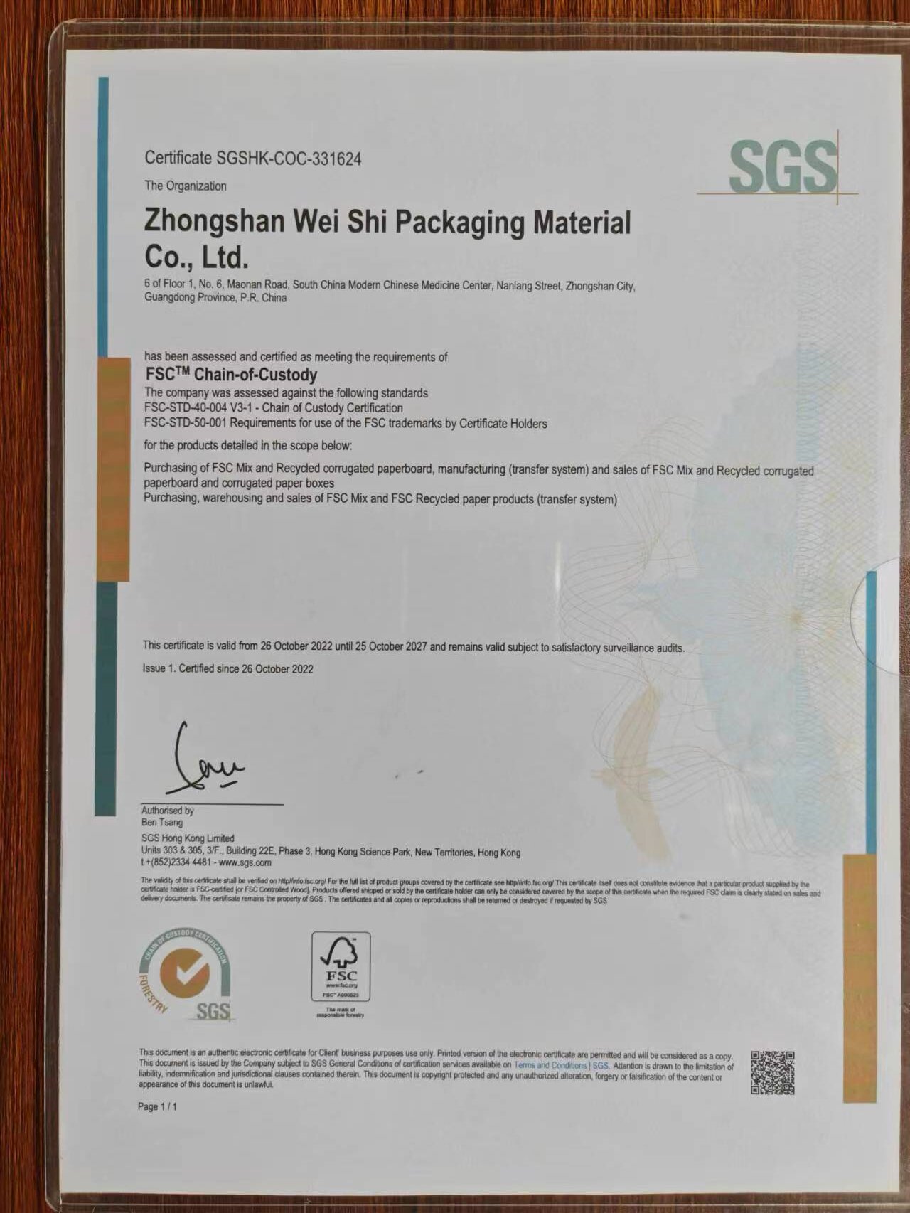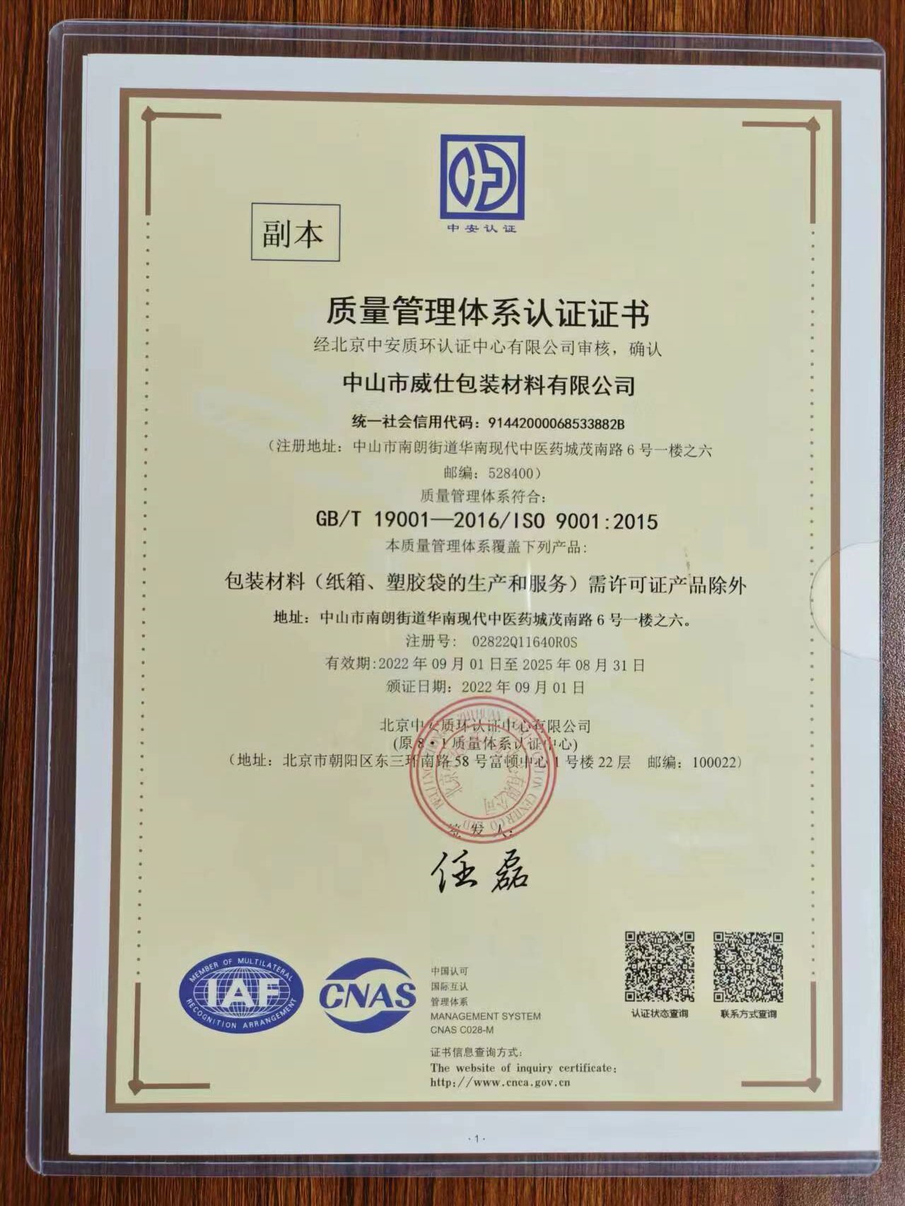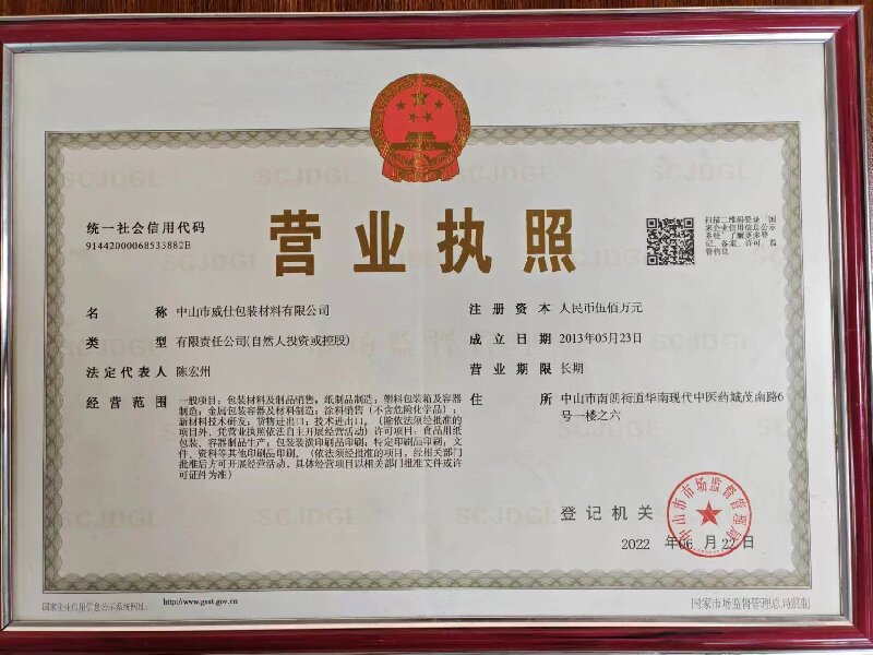 中山威仕包裝材料有限公司創建於2013年5月,公司位於伟人故里中山市南朗街道华南现代中医药城茂南路6号。總投資額500萬人民幣,廠房面積6000平方米,公司通過ISO:9001品質體系認證、FSC森林认证、进出口危险品包装证。